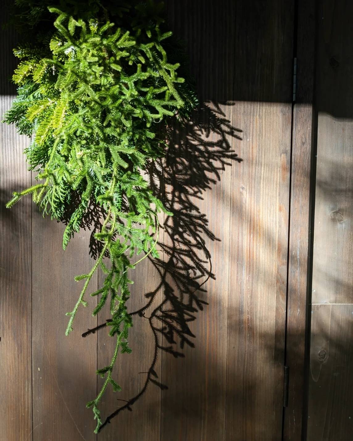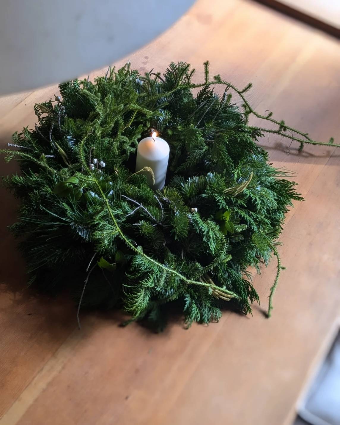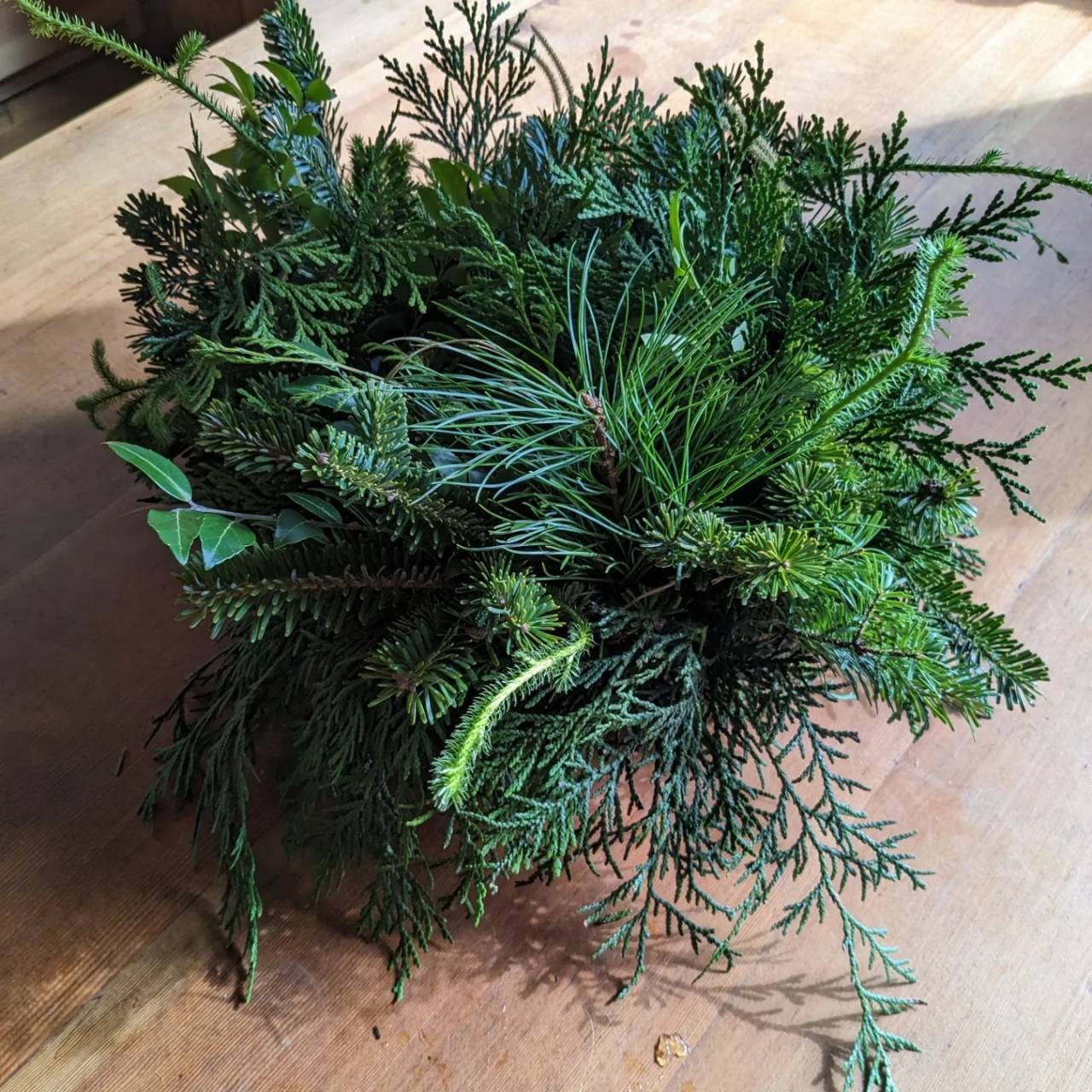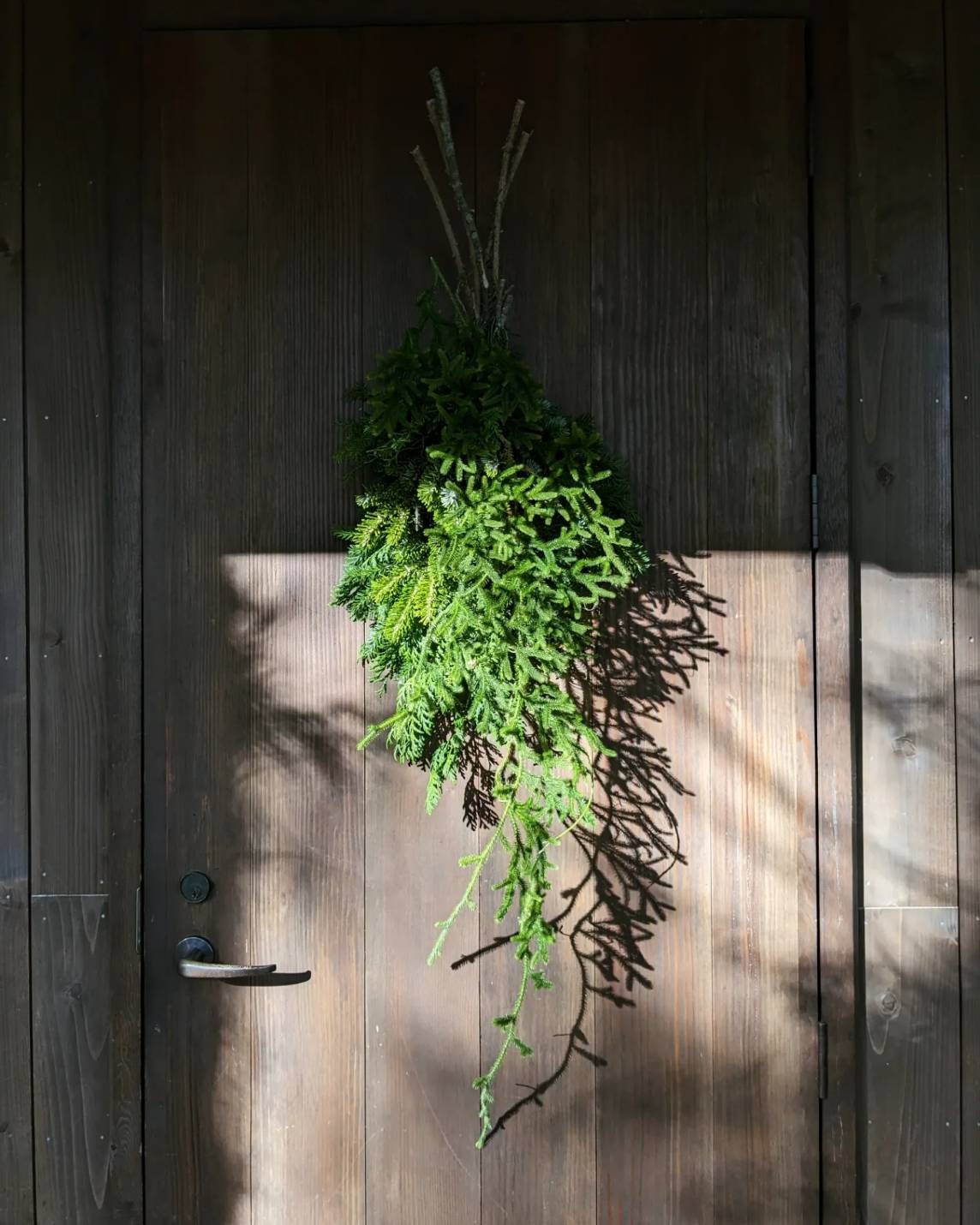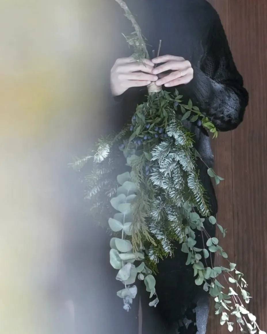 シラビソのフレッシュな枝葉を使った作品は、間伐がある秋冬のみ制作しています。